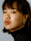 Product shot of the Mixed Pearl Safety Pin (14kt Yellow Gold Safety Pin 27mm Total Length Mixed Freshwater Pearls) Background: Grey backdropMixed Pearl Safety Pin Earring pictured in models first piercing. Styled with other best selling styles.
