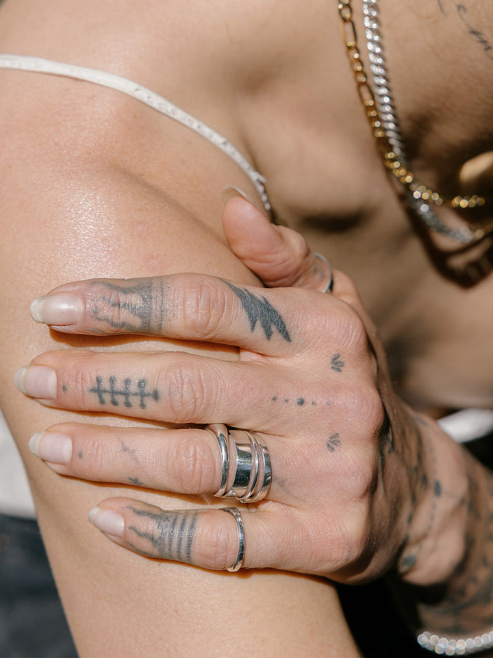 The Echo Band is crafted in solid sterling silver with a slim profile made for stacking. Wear it solo for subtle shine or layer it to add clean contrast to your ring stack. Pairs well with the Hug Band or XL Hug Band.