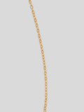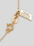 Close up of logo on  thin yellow gold chain necklace with small gold pot leaf pendant.