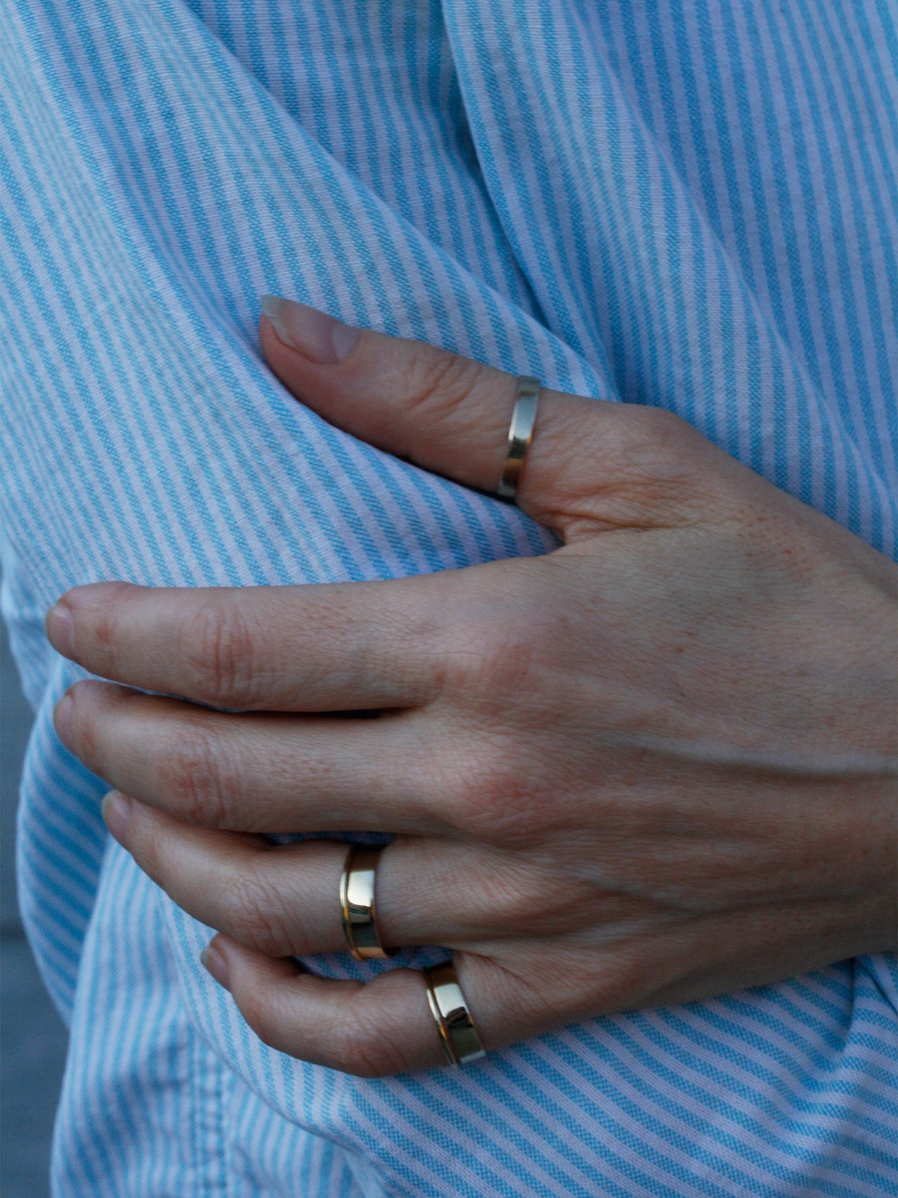 The Hug Band is our mainstay stacking band—lightweight, low-profile, and made for everyday wear. Crafted in 14kt gold with a smooth, rounded shape, it’s designed to layer effortlessly or stand clean on its own.